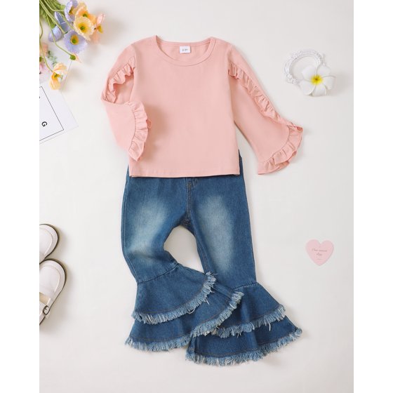 Dress your little one in comfort and style with this Baby Girl 2 Piece Outfit Set, featuring a long-sleeve solid color top and trendy bell-bottom jeans pants. Made from soft, skin-friendly fabric, this toddler girls outfit is gentle on delicate skin and perfect for fall and winter wear.