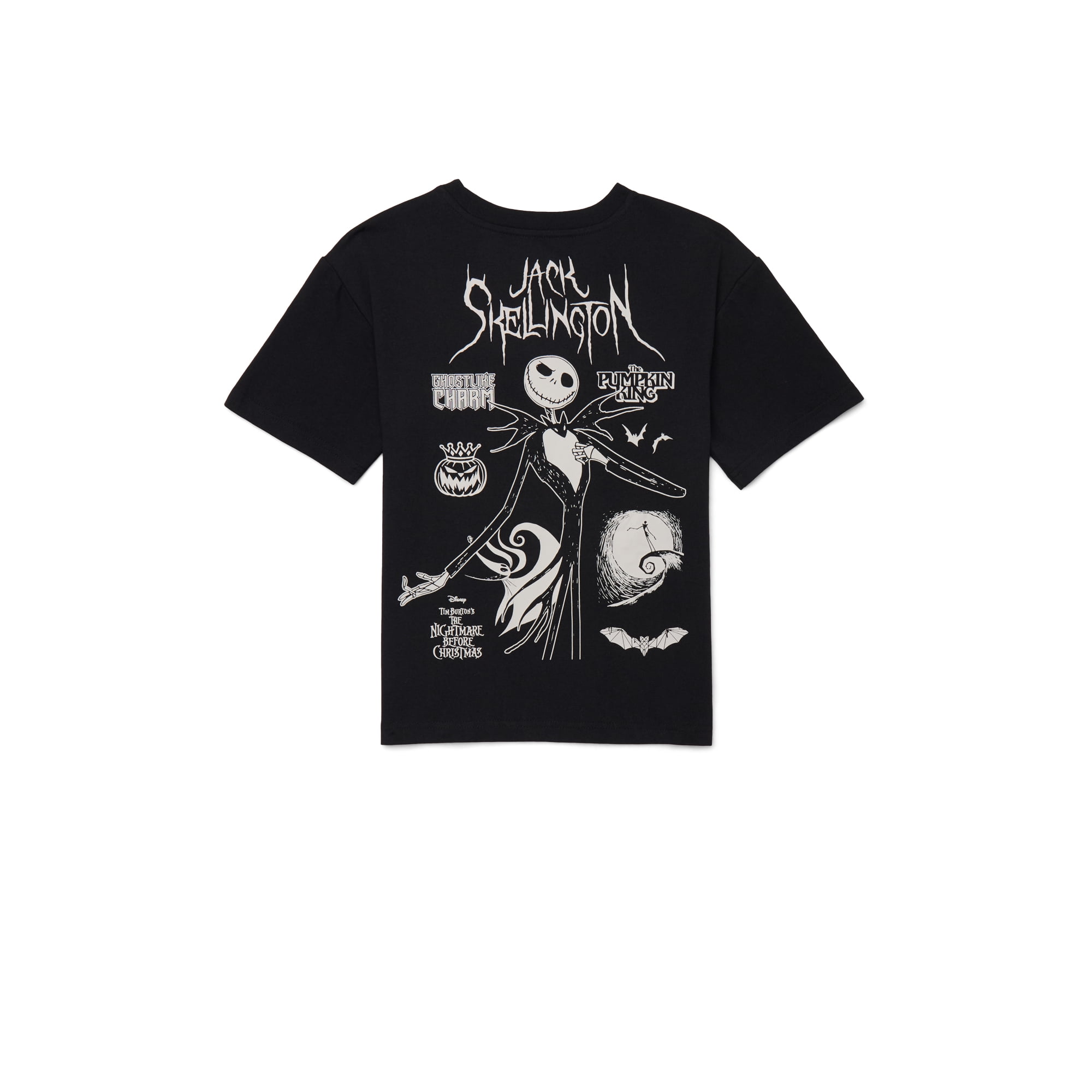 Featuring a bold contrast design on the front chest and a fun Jack Skellington graphic on the back, this short-sleeve tee adds a playful and stylish touch to any outfit. The classic crewneck and pullover style make it easy to wear, while machine-washable fabric ensures hassle-free care.
