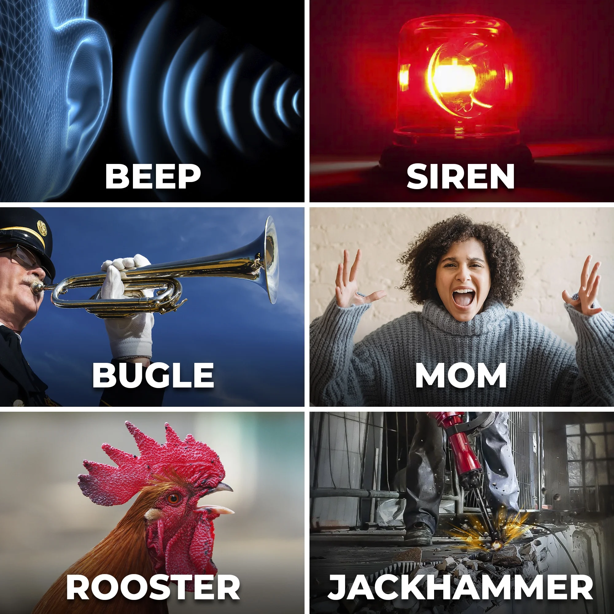 - 6 extremely loud wake-up sounds: Rooster, Bugle, Nagging Mom, Jackhammer, Siren, Loud Beep